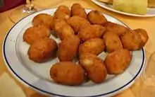 - (cooking) A minced, cooked food (usually meat or vegetables), which is deep-fried in fat and sometimes sprinkled with breadcrumbs.