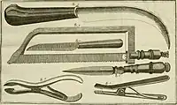 An 18th-century illustration of surgical instruments, with a crowbill (sense 1) shown in the bottom right corner as figure 5.