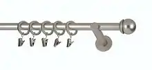 The end of a wall-mounted curtain rod with clips for hanging a curtain, tipped by a simple ball finial for decoration.