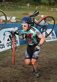 - (cycle racing) A form of bicycle racing consisting of many laps of a short course featuring pavement, wooded trails, grass, steep hills and obstacles and requiring the rider to quickly dismount, carry the bike whilst navigating the obstruction and remount in one motion.