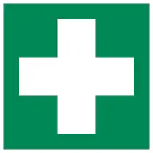 Croes wen ar sgwar gwyrdd yw symbol cymorth cyntaf.