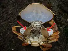 a crab (infraorder Brachyura) with shell partially removed and gill masses or devil's fingers indicated