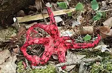 - A fungus, Clathrus archeri, featuring pink or white 'arms' erupting from a white ball-like body, with a putrid odor.