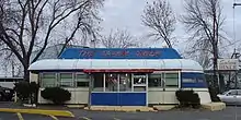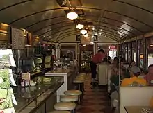 - (US) A typically small restaurant, usually modeled after a railroad dining car, that serves lower-class fare, normally having a counter with stools along one side and booths on the other, and often decorated in 50s and 60s pop culture themes and playing popular music from those decades.