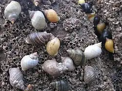 A group of live dog whelks on the barnacles which they eat.