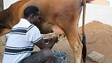 From Proto-Slavic *dojiti, from Proto-Indo-European *dʰeh₁(y)-. Cognate with Upper Sorbian dejić, Polish doić, Czech dojit, Russian дои́ть (doítʹ), and Old Church Slavonic доити (doiti).