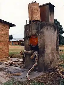 - A water-heating system for domestic use, consisting of a drum of water mounted above a fire.