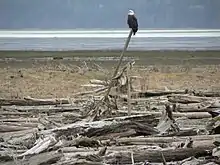 Driftwood provides a perch for a bald eagle on Fir Island, Washington.