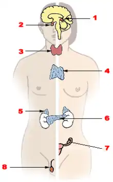 - Hyponyms: pineal gland, hypothalamus, pituitary gland, thyroid gland, parathyroid glands, pancreas, adrenal gland, gonads (ovaries/testes)