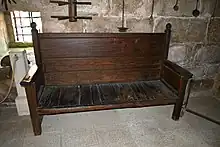 Cognate with Spanish escaño, Italian scanno, Sanskrit स्कम्भ (skambhá).