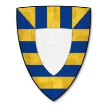 Mortimer, Barry of 6, or & az. an inescutcheon arg. on a chief of the first 2 pallets between as many base esquires of the second.