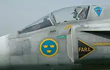 Jet engine air inlet on Saab 37 in the Swedish Air Force, marked 'fara', danger