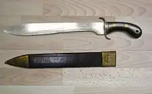 - (historical, military) A large, heavy knife or short sword used as a sidearm and tool by 17th to 19th century infantry and artillery.