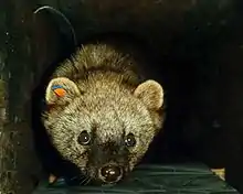 A fisher (Pekania pennanti, syn. Martes pennanti) tagged, in a cage