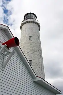 foghorn (third-person singular simple present foghorns, present participle foghorning, simple past and past participle foghorned)