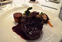fondant potatoes are the cupcake-shaped item to the left of the meat