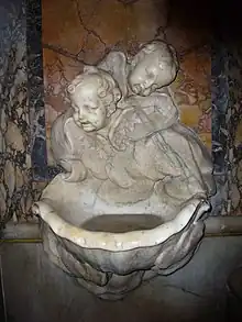 - (Christianity) A receptacle in a church for holy water, especially one used in baptism.