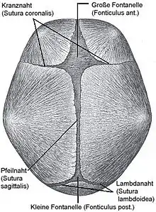 - (anatomy) A soft membraneous spot on the head of a baby due to incomplete fusion of the cranial bones.