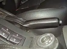 - handbrake, parking brake (hand-operated brake in a car, that can be set to avoid the vehicle rolling down a slope)