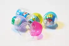 - A small toy sold in a plastic capsule in a vending machine, especially toys sold in or associated with Japan.
