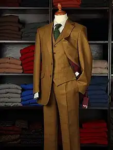 - suit, lounge suit, business suit (set of clothes comprising a suit jacket and trousers of identical textiles generally worn with a collared dress shirt, necktie, and dress shoes)