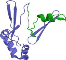 A diagram of the predicted three-dimensional structure of preproghrelin (green and blue) and ghrelin (green)