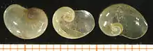 Three gastropod shells of Eucobresia diaphana, scale bar in mm