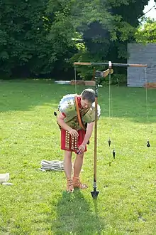 - A Roman surveying instrument having plumb lines hanging from four arms at right angles.