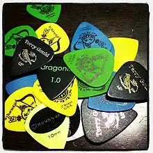 A small piece of plastic, metal, ivory, etc., for plucking the strings of a