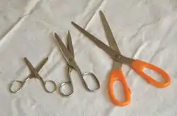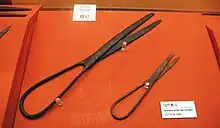 Despite the improbability of it being native, Dempwolff (1938) posited ‘Uraustronesisch’(Proto-Austronesian) *guntiŋ ‘scissors’, and Mills (1975) posited Proto-South Sulawesi *gun(tc)iŋ ‘shears; to cut’. (Blust posits that) The most likely source of this word, which shows irregular sound correspondences in several languages, is some southern form of Chinese, but this is yet to be confirmed. The use of scissors presumably spread widely within a short time because they offered a far more convenient means of cutting hair than was previously possible with the use of single straight blades, as with knives."[1]