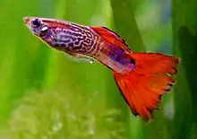 1. A tiny freshwater fish, Poecilia reticulata, popular in home aquariums, that usually has a plain body and black or dark blue tail for the females and a more colorful tail for the males.