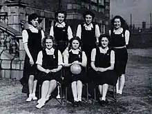 The Hyde Grammar School netball team, 1949, wearing gymslips (Manchester, UK).