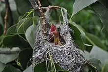 - The Baltimore oriole (Icterus galbula), whose nest is suspended from the limb of a tree.