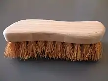 - brush (piece of conductive material, serving to maintain electrical contact between the stationary and rotating parts of a machine)