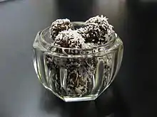 - a confectionery consisting of a mixture of oatmeal, sugar, cocoa and butter, rolled into balls with approximate diameters of 1-2 cm and then in desiccated coconut; known in Swedish as chokladboll