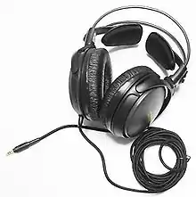 - A cushioned speaker placed on, over, or inside the ear, normally used in left/right pairs.