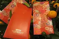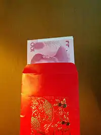 - (rare) hongbao: in some Chinese communities, a decorated paper envelope, traditionally red, containing a gift of money presented during special occasions such as birthdays, weddings, and the Chinese New Year.