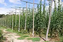 - (agriculture, British) A field, fields or farm where hops are grown.