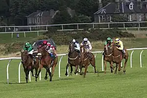 Horses racing at Musselburgh Racecourse in Musselburgh, East Lothian, Scotland, UK. The phrase horses for courses alludes to the fact that a racehorse performs best on a racecourse to which it is specifically suited.