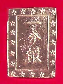 - (historical) An old gold or silver coin of Japan, rectangular in shape. It corresponded to the ichibugin or ichibuban, and was used during the Edo period prior to the introduction of the yen in 1871.