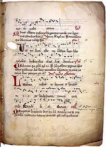 A page from a 14th- or 15th-century missal.[n 1] The fourth passage, up to the first word of its third line, is the introit (sense 1), and reads “Laetabitur justus in Domino, et sperabit in eo: et laudabuntur omnes recti corde” (“The just shall rejoice in the Lord, and shall hope in him: and all the upright in heart shall be praised”).