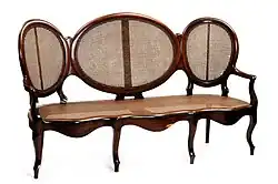 - (furniture) a canapé (older type of upholstered sofa with a back, armrests and 6-8 legs, shaped like several continuous chairs)