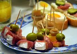 - a canapé (an hors d’oeuvre, a bite-sized open-faced sandwich made of thin bread or toast topped with savory garnish.)