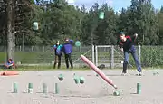 The game of kyykkä. In the photo, karttu is the pink object that is thrown at the green pegs.