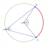 The central angle () and the inscribed angle () corresponding to the red arc AB.