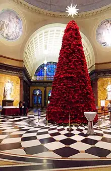An arrangement of kerststerren (pointsettias) in the shape of a Christmas tree with a kerstster (star) on top.
