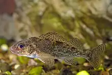 From Proto-Finnic *kiiski. Cognates include Finnish kiiski and Estonian kiisk.