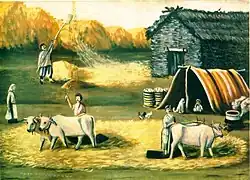 - barn floor, earthen floor, threshing floor (dense, smooth surface, typically consisting of compacted clay or earth; floor made of compacted clay, earth, cement, bricks)