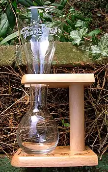 - beer glass resembling a volumetric flask with a round bottom and a separate wooden holder; similar to a short ell glass or yard of ale