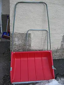 - snow scoop, snow sled shovel, snow sleigh shovel (hand tool for removing snow by pushing and sliding)